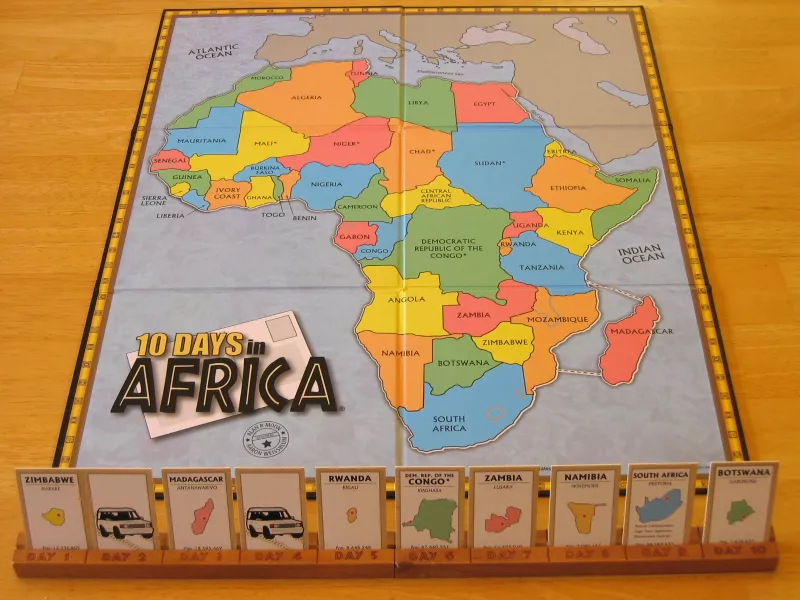 10 Days in Africa is an engaging geographical puzzle where players plan a 10-day journey across the African continent. Players draw and arrange country cards along with transportation cards (foot, car, or plane) to create a continuous route. The educational value comes naturally through gameplay as players learn the relative locations of African countries and which ones share borders or are close enough for air travel.