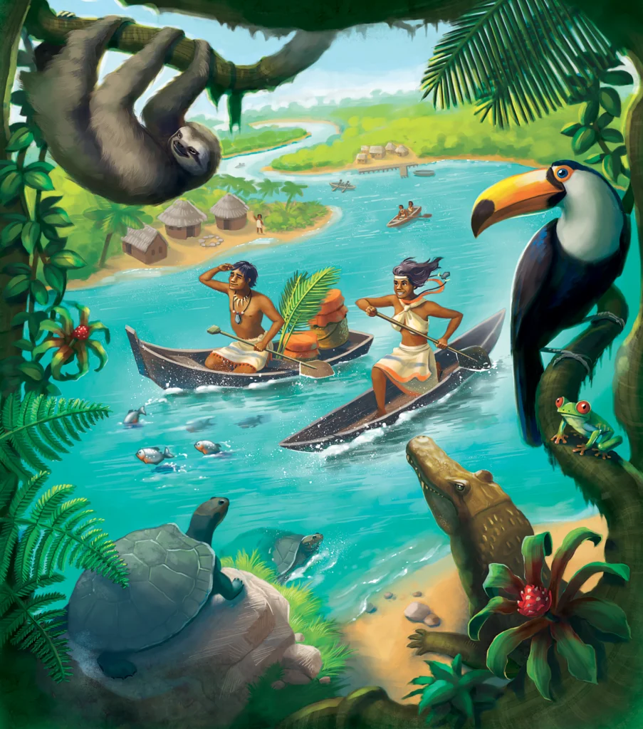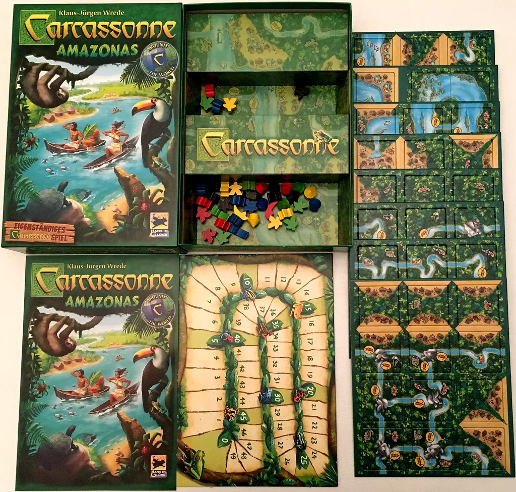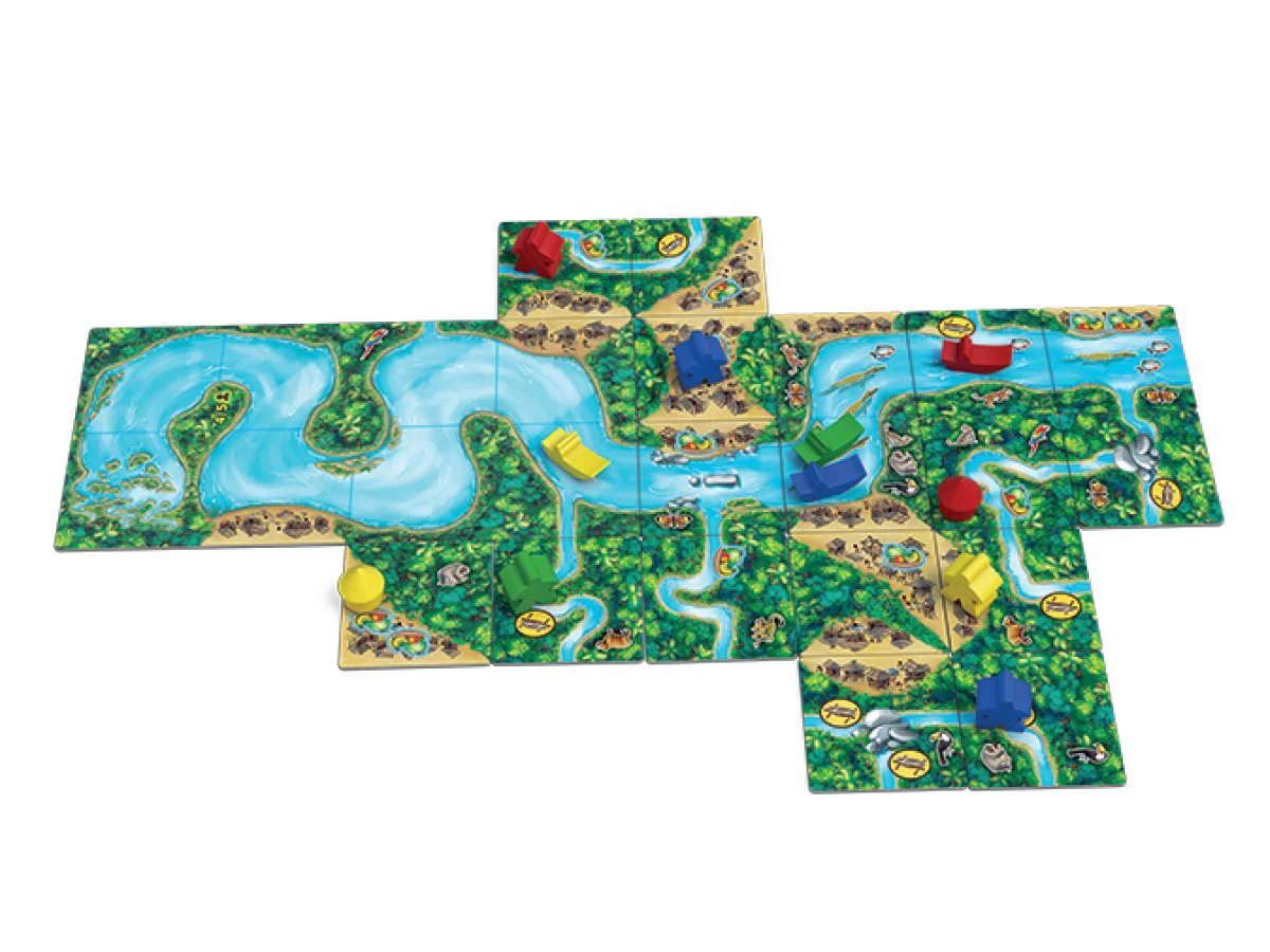 In Carcassonne: Amazonas, players sail their boats to the Amazon to discover abundant wildlife. Players score points not only for discovering animals, but also for visiting native villages and water courses while their boat moves forward on the Amazon.