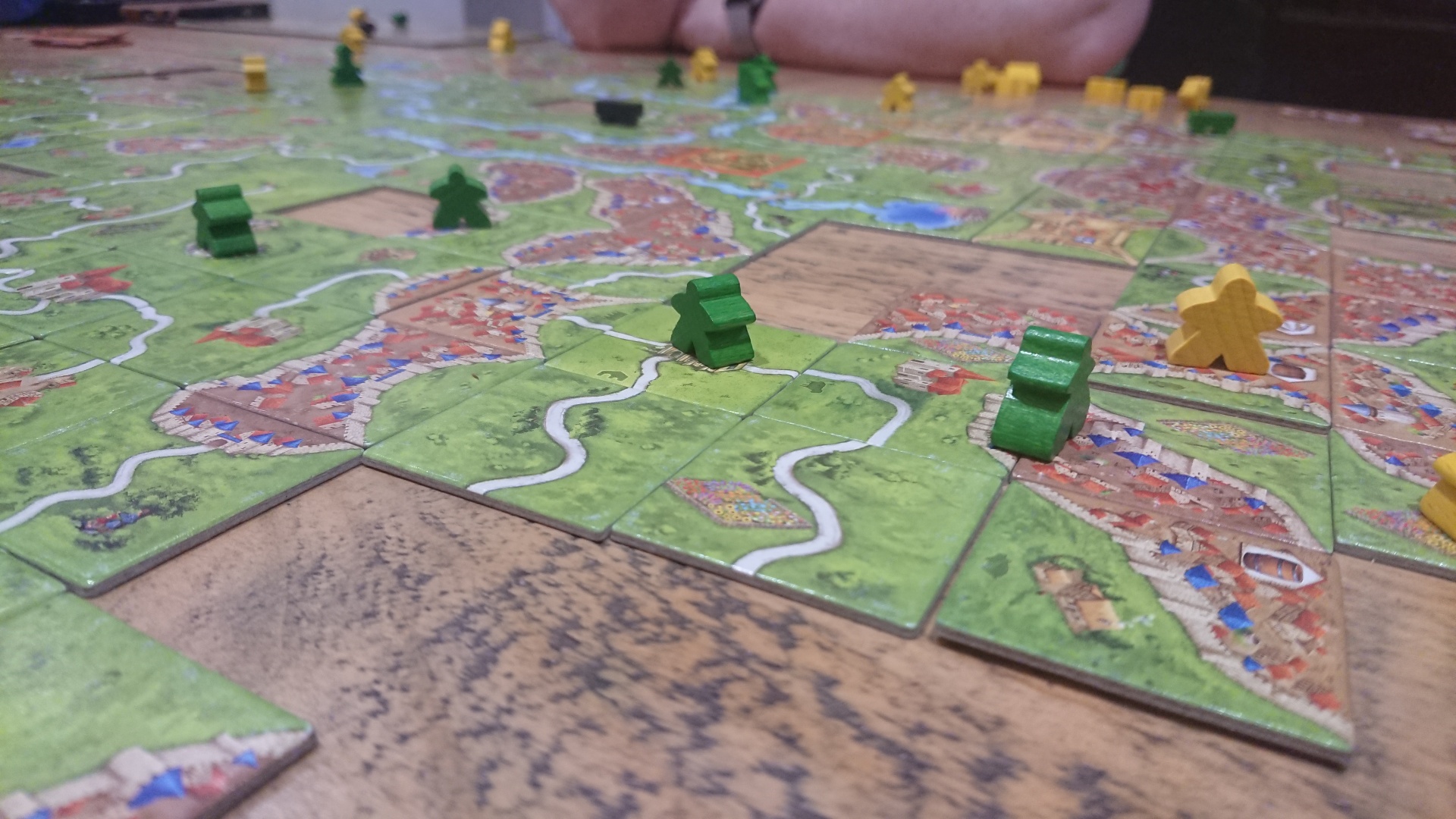 Carcassonne is a tile placement game in which the players draw and place a tile with a piece of southern French landscape represented on it. The tile might feature a city, a road, a cloister, grassland or some combination thereof, and it must be placed adjacent to tiles that have already been played, in such a way that cities are connected to cities, roads to roads, et cetera. Having placed a tile, the player can then decide to place one of their meeples in one of the areas on it: in the city as a knight, on the road as a robber, in the cloister as a monk, or in the field as a farmer. When that area is complete that meeple scores points for its owner.