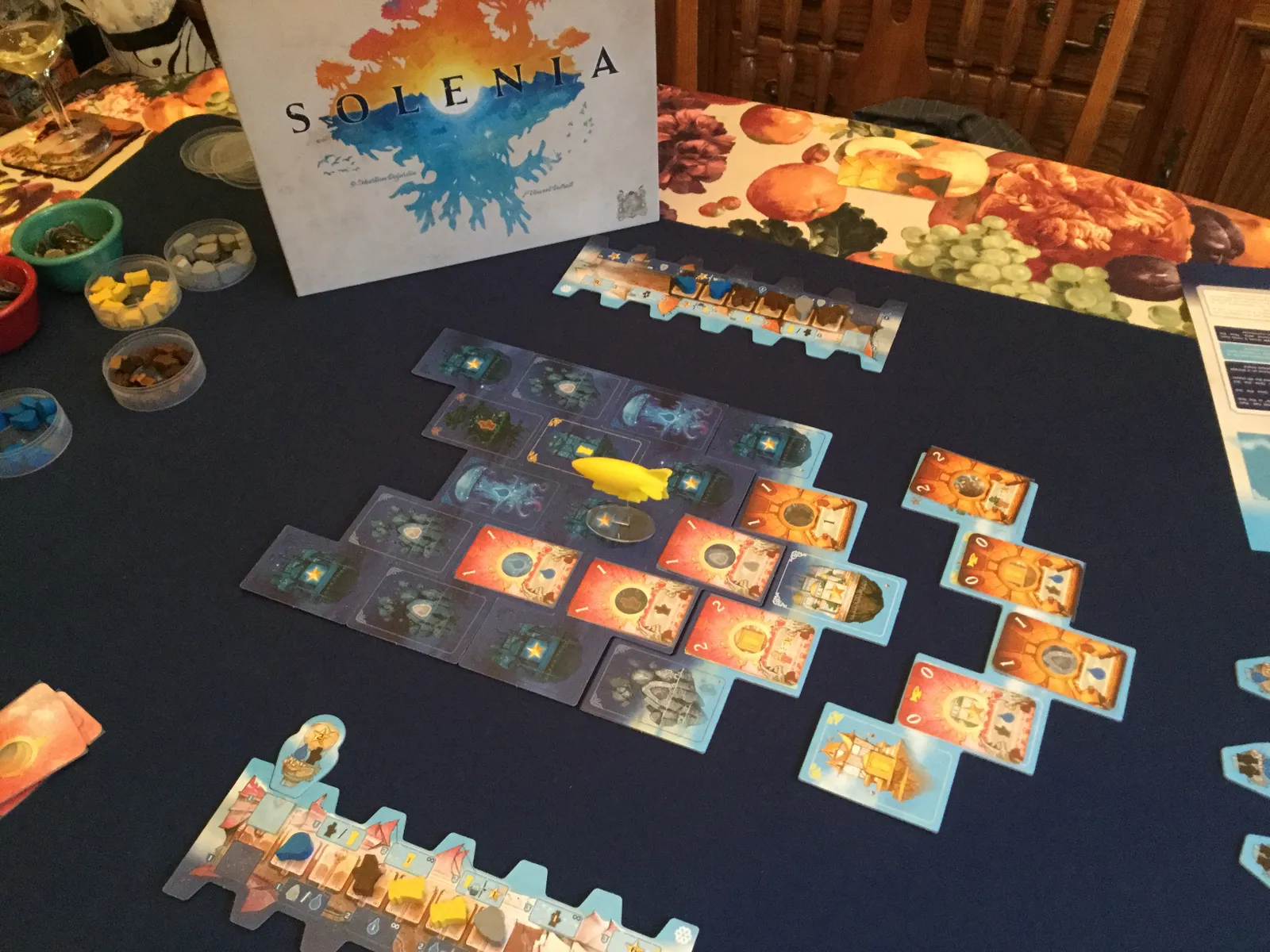 In Solenia, players manage a hand of cards to interact with a modular, scrolling board. By playing cards onto production floating islands, you gather essential resources like water and wheat from the day side, or stone and wood from the night side. The clever twist lies in how the board moves: every time the airship advances, the trailing edge of the board is flipped and moved to the front, changing the landscape from day to night (or vice versa) as you progress.